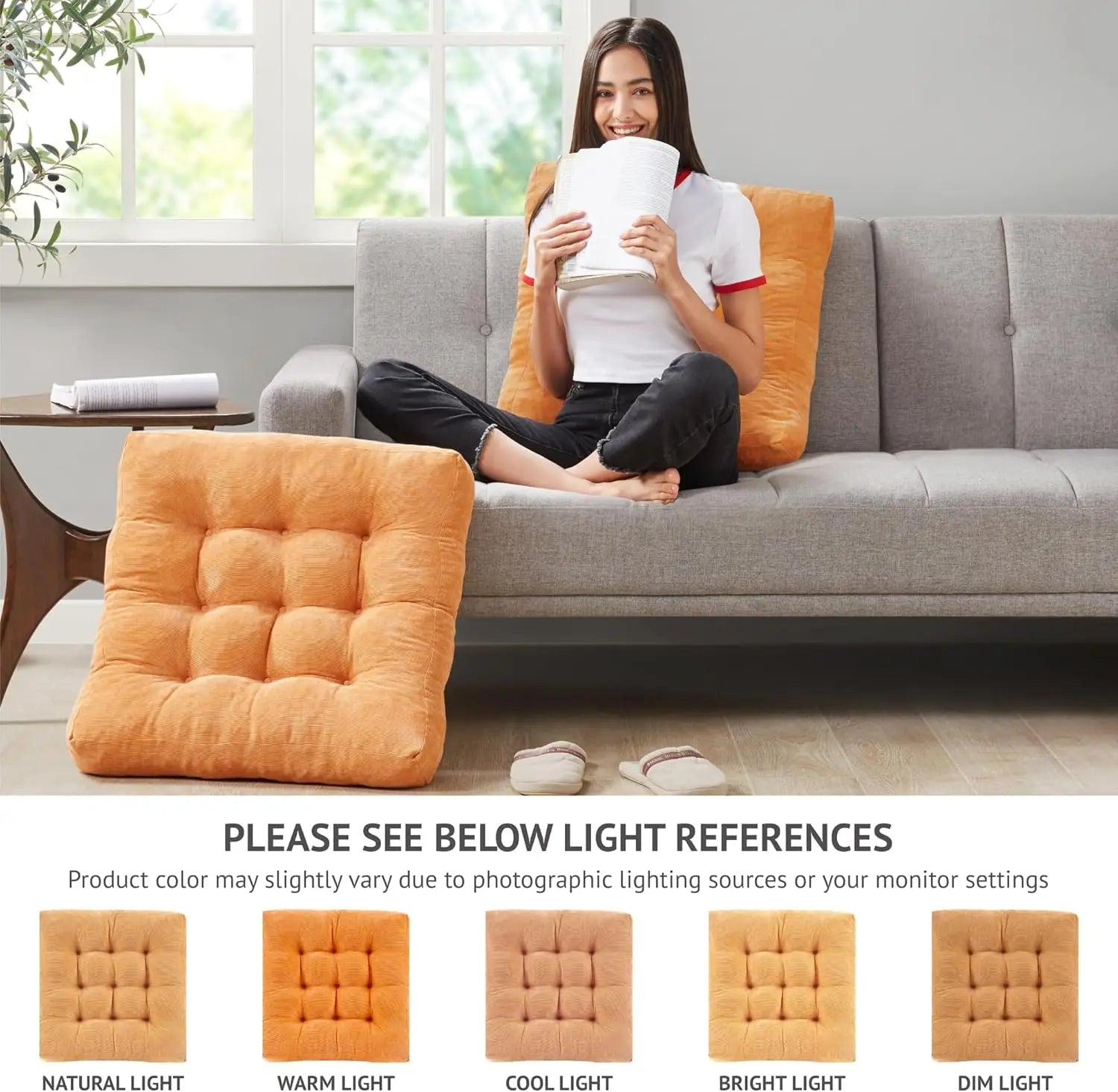 Product Features: 1. Enhanced Comfort with Memory Foam: This floor cushion features added memory foam for superior rebound speed and durability compared to standard PP cotton fillings. It quickly restores its original shape under any weight, providing long-lasting support for comfortable seating over extended periods. 2. Plush Seating Experience: Each pillow measures 22 x 22 inches with a thickness of 3.15-3.94 inches (8-10 cm), offering ample cushioning for two children or one adult. The high-quality filling ensures you won't feel the hard floor or chair beneath, while the vibrant orange yellow color adds a beautiful touch to any room decor. 3. Versatile Multi-Purpose Use: Lightweight and easy to move, these pillows create extra seating space in living rooms, balconies, patios, and outdoor areas. Perfect for reading, meditation, board games, chatting with friends, watching TV, or playing with kids. They also come in attractive packaging, making them an ideal gift for housewarmings, birthdays, holidays, and special occasions. 4. Durable Construction Details: Crafted from soft corduroy fabric that feels gentle to the touch. Nine reinforced stitching points prevent deformation and add a stylish appearance. The thoughtful design provides excellent back support and helps alleviate discomfort during prolonged sitting. 5. Easy Care Instructions: For optimal longevity and performance, spot clean only—do not machine wash or immerse in water. Upon arrival, the pillows may be compressed due to packaging; allow them to expand fully by leaving them exposed for several hours (longer is better) until they reach their listed dimensions. 6. Ideal for Various Settings: Whether used indoors on tatami mats or outdoors on balconies and patios, these cushions blend functionality with aesthetic appeal. Their solid color scheme complements diverse interior styles effortlessly.